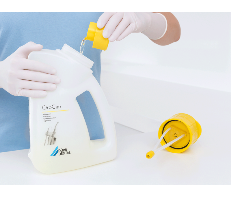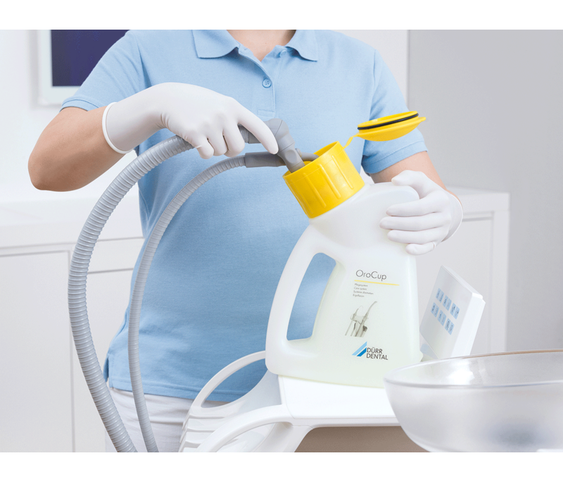 Система ухода OroCup care system Durr Dental предназначена для правильного разведения рабочих растворов, проведению эффективной дезинфекции и очистки аспирационных систем и сепараторов амальгамы.
